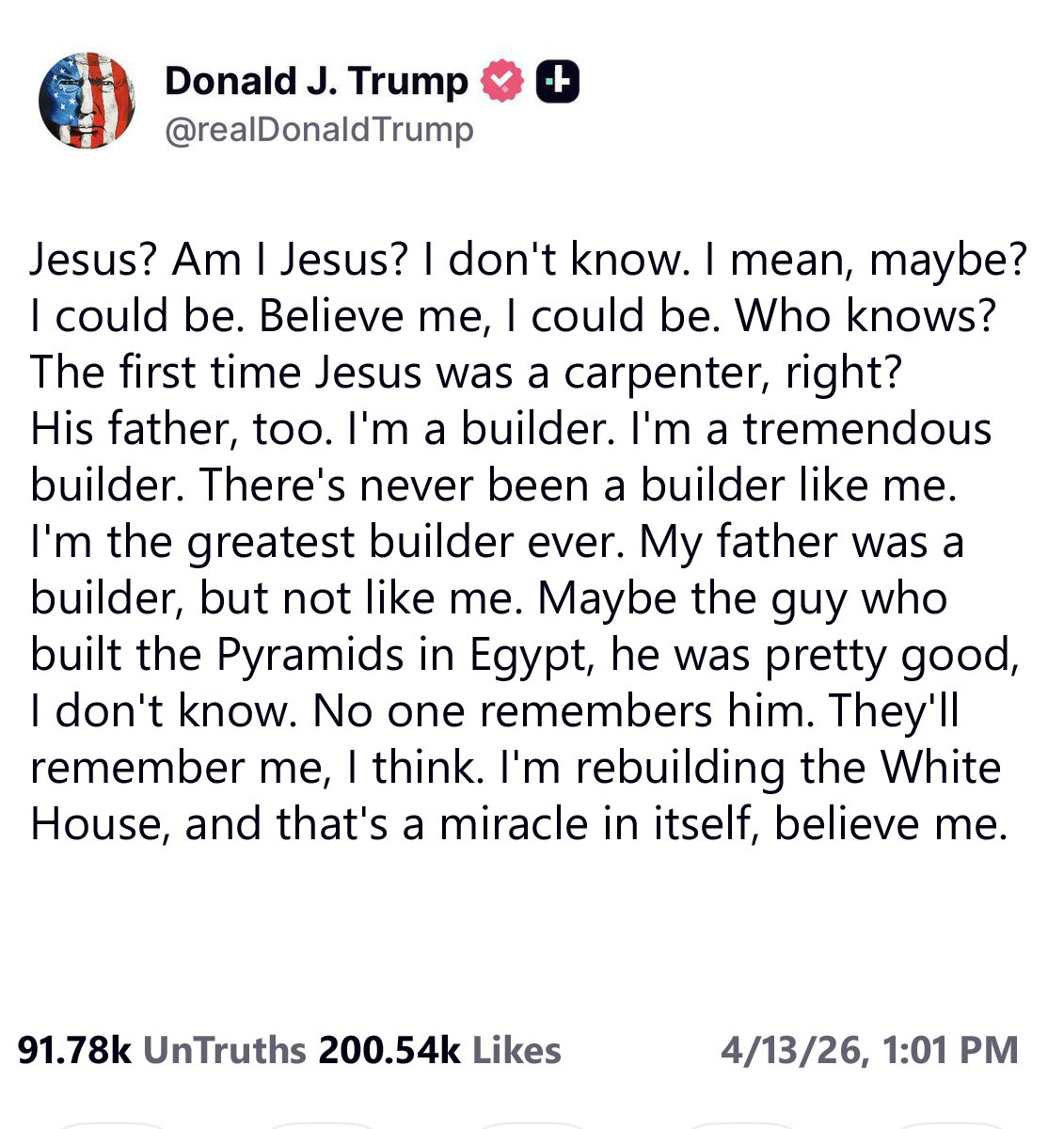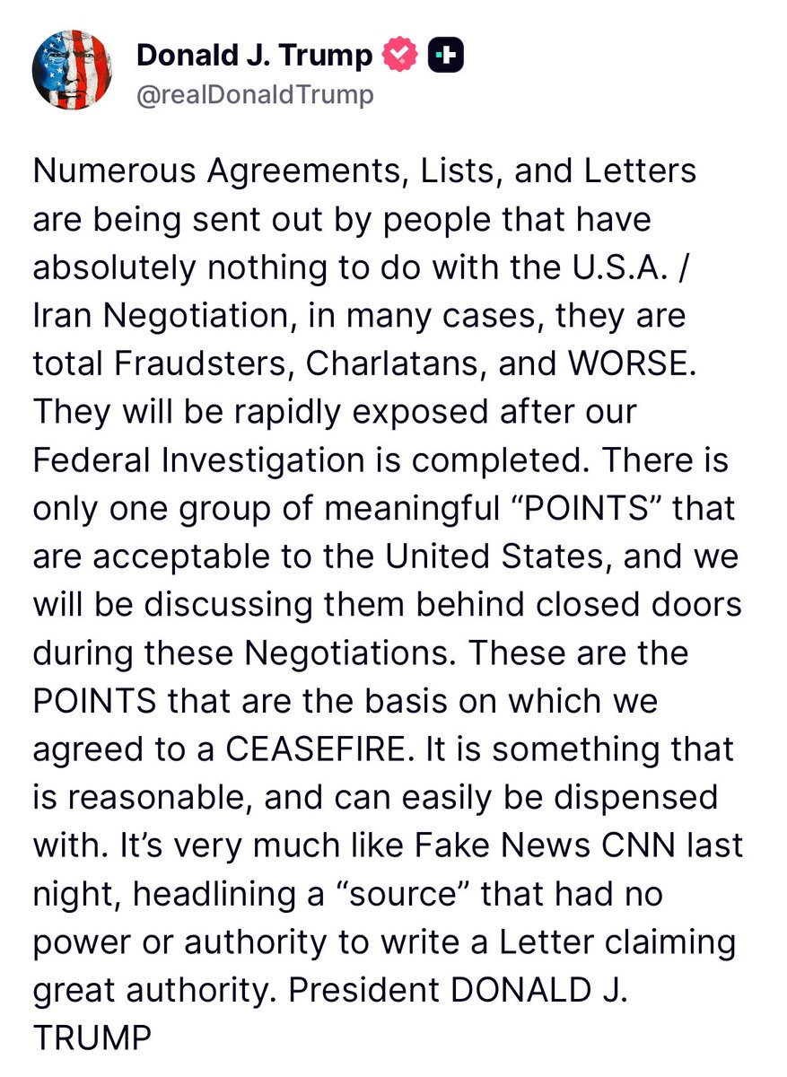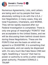 >Trump: Numerous Agreements, Lists, and Letters are being sent out by people that have absolutely nothing to do with the U.S.A. / Iran Negotiation, in many cases, they are total Fraudsters, Charlatans, and WORSE. They will be rapidly exposed after our Federal Investigation is completed. There is only one group of meaningful “POINTS” that are acceptable to the United States, and we will be discussing them behind closed doors during these Negotiations. These are the POINTS that are the basis on which we agreed to a CEASEFIRE. It is something that is reasonable, and can easily be dispensed with. It’s very much like Fake News CNN last night, headlining a “source” that had no power or authority to write a Letter claiming great authority.
