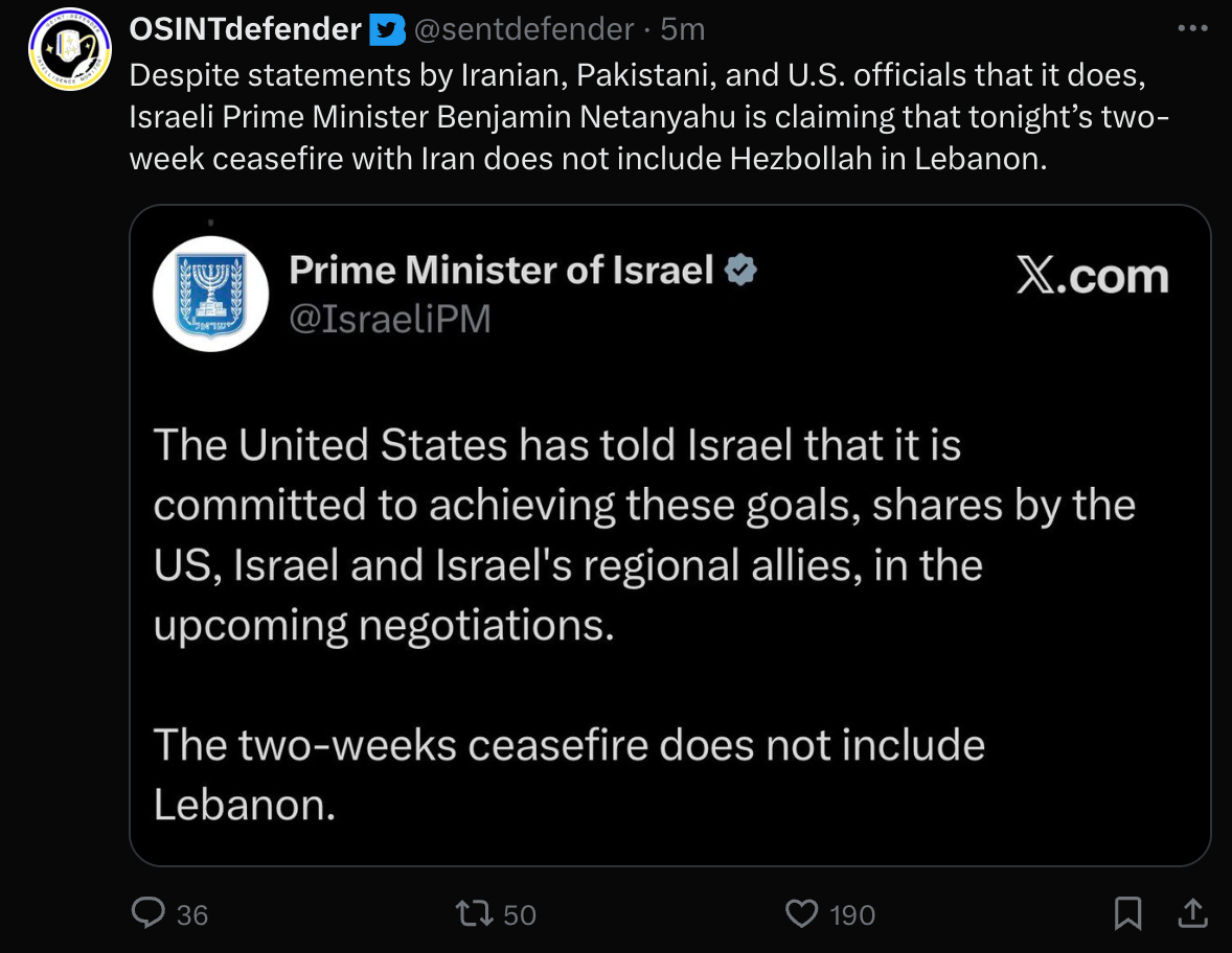>Netanyahu: The temporary ceasefire with Iran will not include Lebanon. Today, we have given Hezbollah the strongest blow they have suffered since the pagers